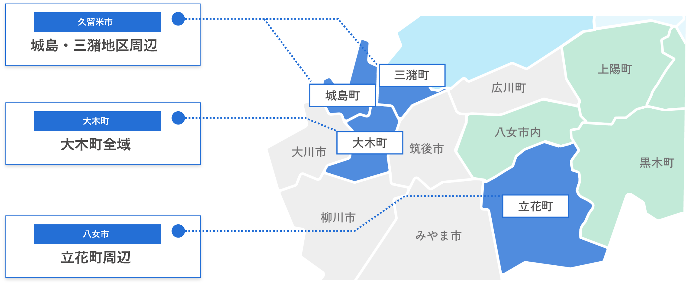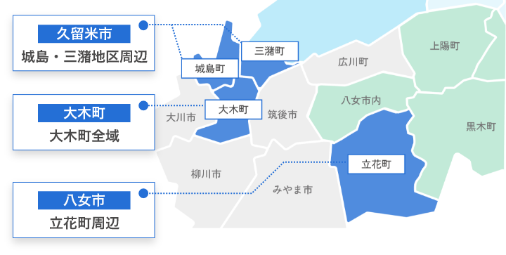 立花商事は、「八女市」「大木町」「久留米市」を中心に